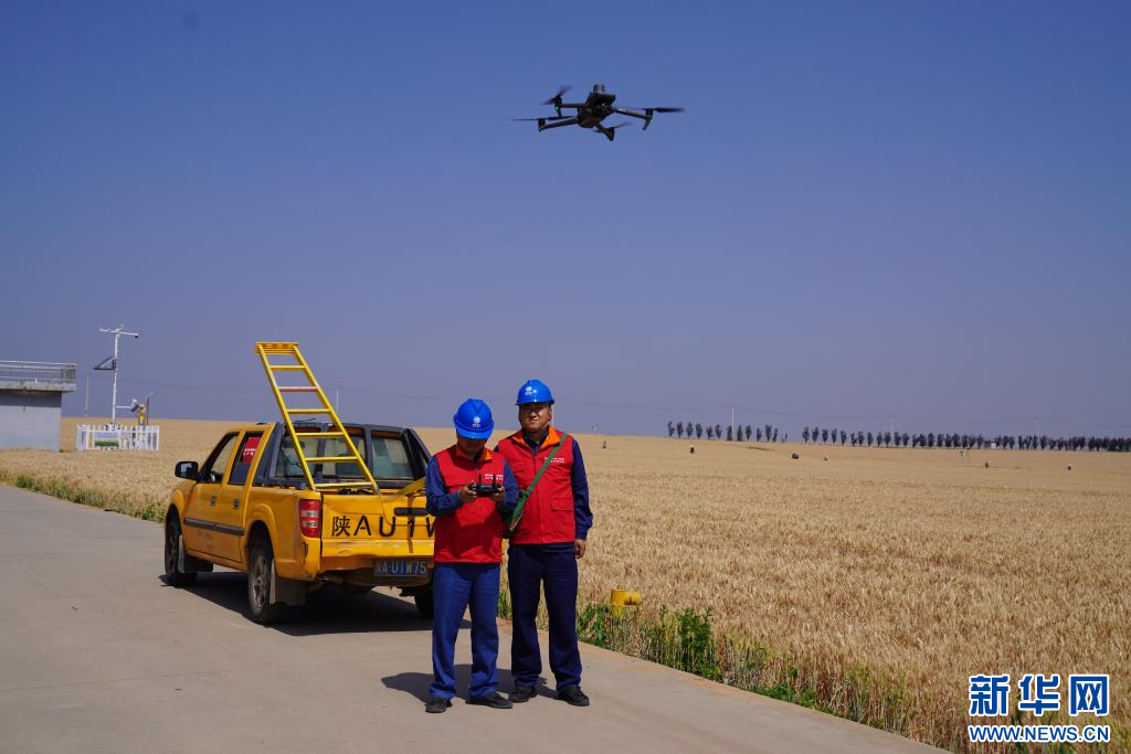 图为国家电网西安市长安区供电公司工作人员在神禾塬机收现场操作无人机助力夏收。(蒿曦 摄)