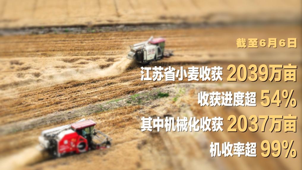 眼下,江苏全省小麦收获进入高峰期。据全省农情调度,截至6月6日,全省小麦收获2039万亩,收获进度超54%,其中机械化收获2037万亩,机收率超99%。苏南地区收获结束,苏中地区收获接近尾声,苏北地区收获近四成。