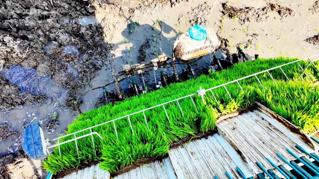 在江苏省常州市天宁区青龙街道武城村的稻田里,3台插秧机来回穿梭在田间,碾过泛起涟漪的水田,将一株株嫩绿的秧苗精准植入大地,种下丰收的希望。