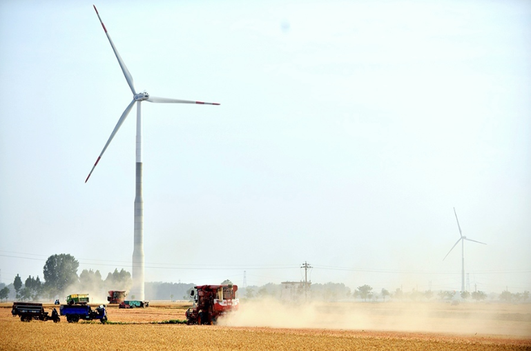 6月5日,在河南省滑县高平镇高标准农田内,收割机正在抢收小麦。新华社发(王克伟)摄