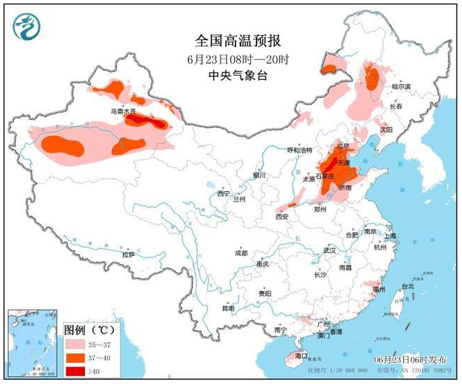 预计6月23日白天,北京大部、天津、河北中南部、山东中北部、河南北部、汾渭平原以及内蒙古东部、辽宁中西部、吉林西部、新疆准噶尔盆地和南疆盆地等地有35℃以上的高温天气。其中,北京中南部、天津中西部、河北中南部、山东北部及南疆盆地等地部分地区最高气温37℃~39℃,局地可达40℃以上。