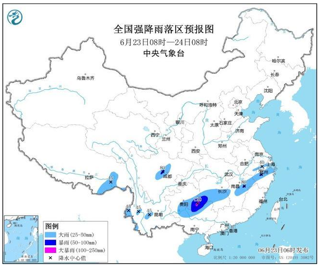 预计,6月23日8时至24日8时,浙江中北部、江西中部、湖南中部、贵州中南部、广西北部、云南中西部、四川盆地西部以及西藏东南部等地部分地区有大到暴雨,其中,贵州东南部等地局地有大暴雨(100~120毫米)。上述部分地区伴有短时强降水(最大小时降雨量20~50毫米,局地可超过60毫米),局地有雷暴大风等强对流天气。