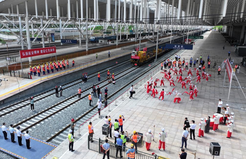 7月1日在延安站拍摄的西延高铁轨道贯通仪式(无人机照片)。新华社记者 张博文 摄