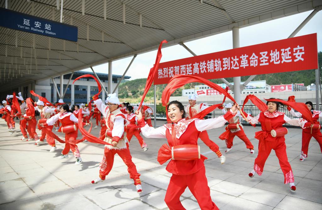 7月1日,演员在延安站表演腰鼓庆祝西延高铁实现轨道贯通。新华社记者 张博文 摄