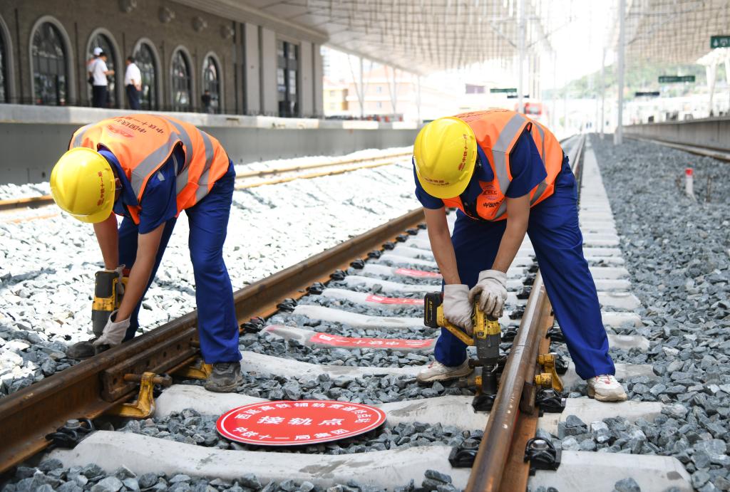 7月1日,中铁十一局工人在延安站施工。新华社记者 张博文 摄