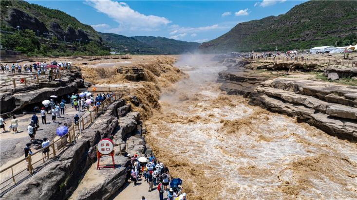7月4日,受黄河上游水库泄洪的影响,位于秦晋峡谷的陕西黄河壶口瀑布迎来了今年最大水流量,相较平时水流量上涨7倍。从空中俯瞰,奔腾的河水呼啸而下,主副瀑布携手倾泻,出现“水岸齐平”、“金涛拍岸”的壮美景观,正式进入今年最佳观赏期。(霍勇 宋洋波)
