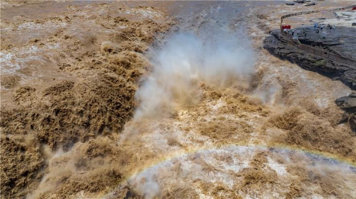 壮美的黄河壶口瀑布上方出现彩虹景观
