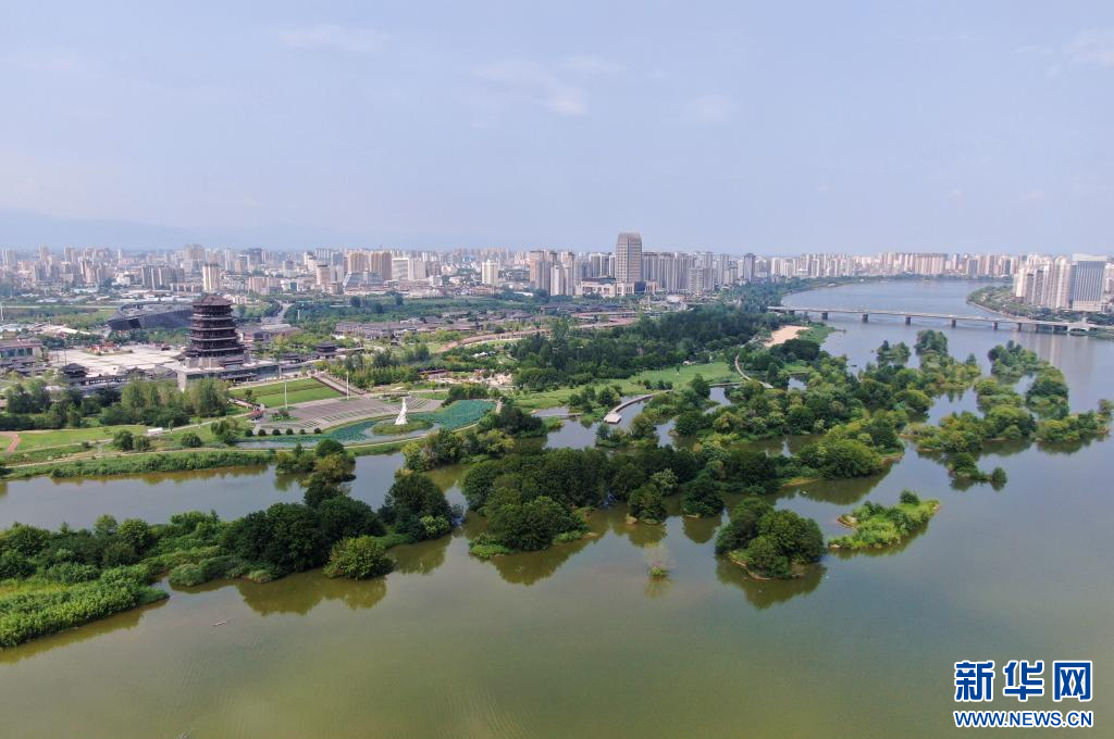 这是位于长江最大支流汉江畔的汉中市天汉湿地公园(7月21日摄,无人机照片)。新华社记者 李一博 摄