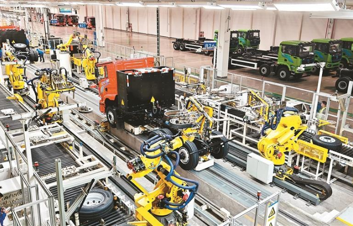 今年上半年,西安汽车产业产值1585.85亿元,同比增长26.0%。图为陕汽新能源重卡生产基地汽车总装配线。(资料图片)