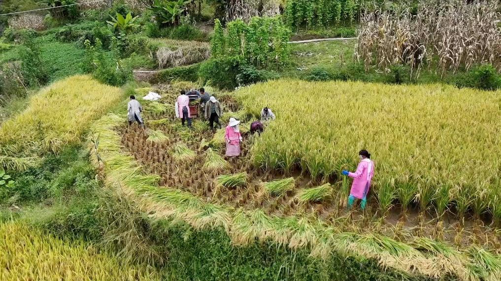 陕西省岚皋县官元镇600余亩水稻开镰收割。连日来,频繁的降雨天气对水稻收割造成不利影响,当地政府积极组织农户利用降雨间歇,争分夺秒抢收成熟水稻。