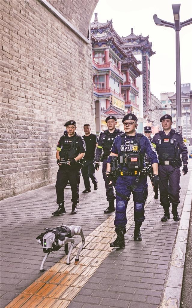 10月1日,西安公安碑林分局反恐怖和特警大队携机器犬在南门开展巡逻,保障旅游景区周边秩序。