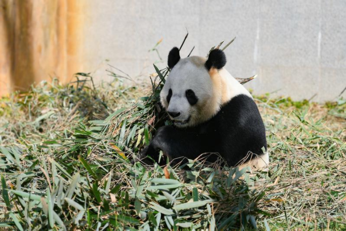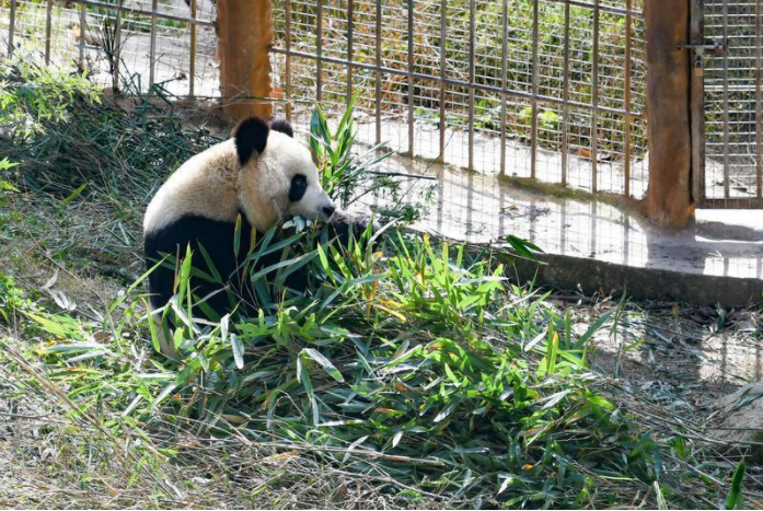 住在“党生”隔壁的“全运”更是“纯纯干饭熊”。“它不仅吃得专注,而且还把竹竿上竹叶吃得特别干净。”杨丽说。果不其然,记者在圈舍外场下坡处看到了坐着吃饭的“全运”。在四只圈养大熊猫中,它的进食时间最长,别的大熊猫吃完饭都已进入午休状态,唯独它还在做原地埋头“干饭”,就连掉在地上的碎竹叶,它都要伸着脖子捡起来吃掉。