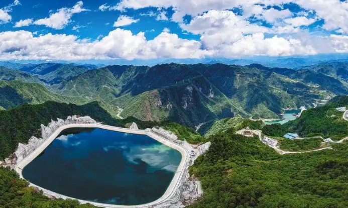 蓝天白云下的镇安抽水蓄能电站上水库,在葱郁的青山间十分壮观,一幅“高峡出平湖、绿水绕青山”的画卷徐徐展开。(倪方海 摄)