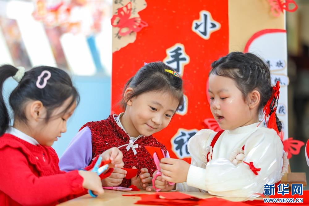 12月30日,小朋友在山东省青岛市李沧区青山路幼儿园开展的迎新年活动中体验剪纸。