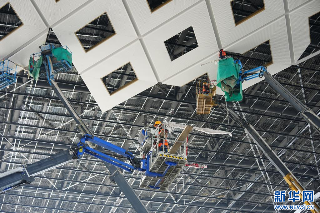 2月26日,工人在西安东站候车大厅内部进行吊顶安装。