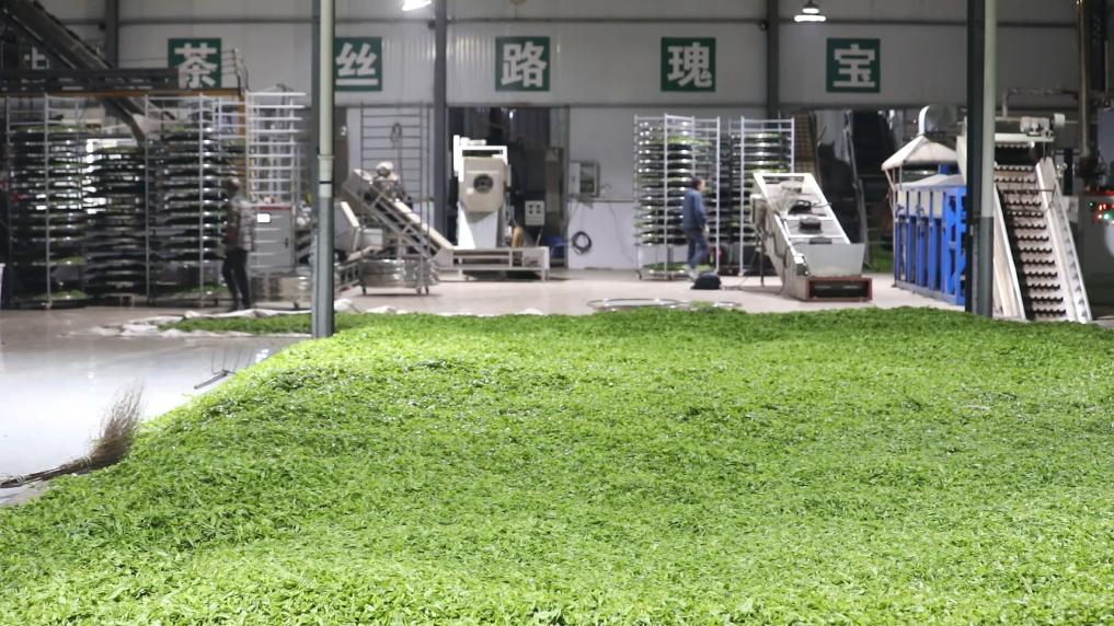 在西乡县秦丝茶业有限公司,工人们把收购来的鲜叶经过数小时摊晾后,连夜炒制,车间里一派忙碌。