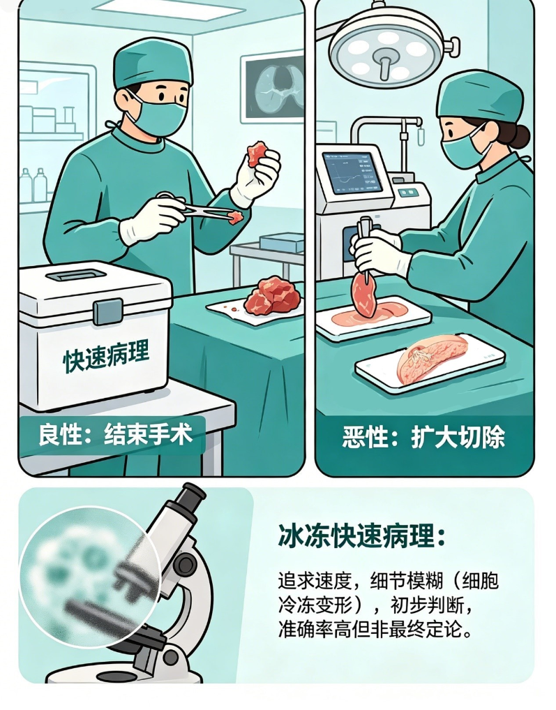 手术做到一半,外科医生切下一小块组织,立刻送到病理科。我们用低温把组织快速冻硬,切成薄片,显微镜下快速观察。目的只有一个:给手术当场指路 —— 是良性就结束手术,是恶性就要进一步处理。
