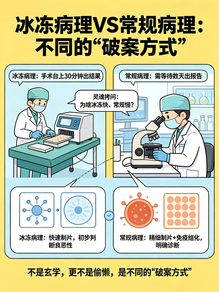 很多患者都有灵魂拷问:手术台上的冰冻病理,半小时就能出良恶性,为啥平时一份常规病理报告,要等好几天?病理医生是不是故意拖延?