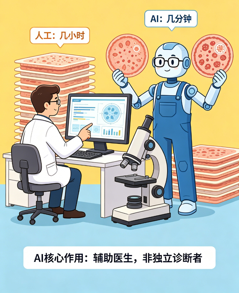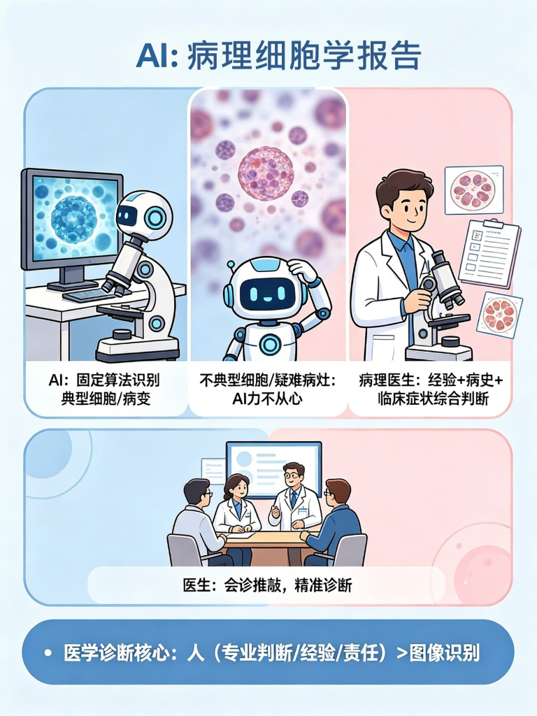 简单来说,AI能“看片”,却不懂“看病”;能识别典型病变,却无法应对复杂的疑难案例。它可以高效完成基础的阅片筛选工作,帮医生节省时间和精力,让医生能专注于更复杂的诊断和治疗方案制定;而病理医生的专业判断、临床经验和责任担当,是AI无法复制的——毕竟,医学诊断的核心是“人”,而非单纯的“图像识别”。