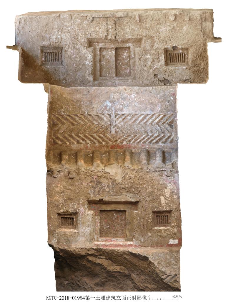 考古工作者还在M4过洞上方及前室顶部,发现3处土雕建筑。据项目负责人、陕西省考古研究院副研究员于春雷介绍,其中,前室顶部的这处土雕建筑为仿木构盝顶,其中央雕刻有九宫格藻井,这在十六国墓葬考古发现中当属首例,具有重要研究价值。