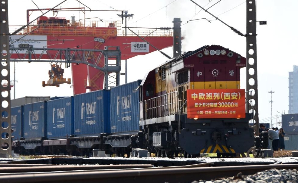 当日上午,满载着55个集装箱光伏组件的X9043次中欧班列从西安国际港站驶出,开往阿塞拜疆巴库,标志着中欧班列(西安)自2013年开行首列以来累计开行突破30000列,开行总量超过全国中欧班列累计开行总量的四分之一。