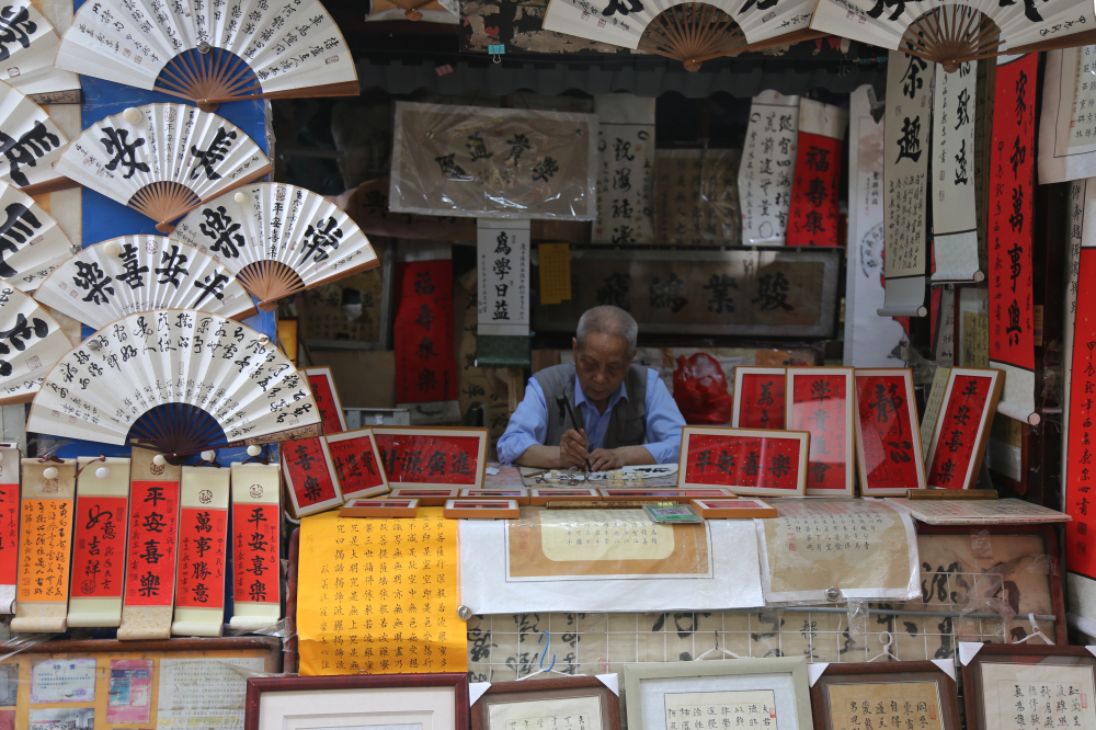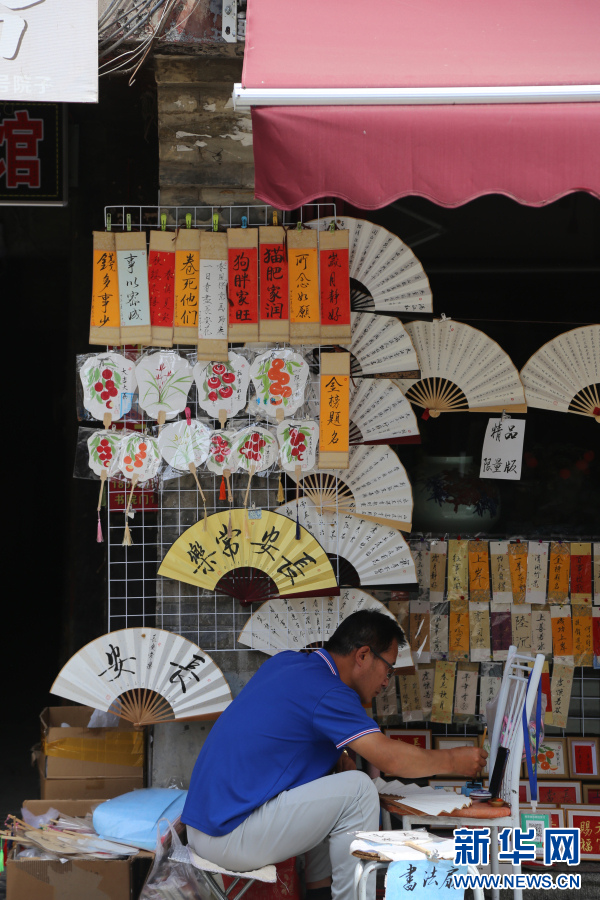4月22日,书院门一位摊主在埋头作画。书院门里处处都能感受到浓厚的文化氛围。新华网 张思思 摄