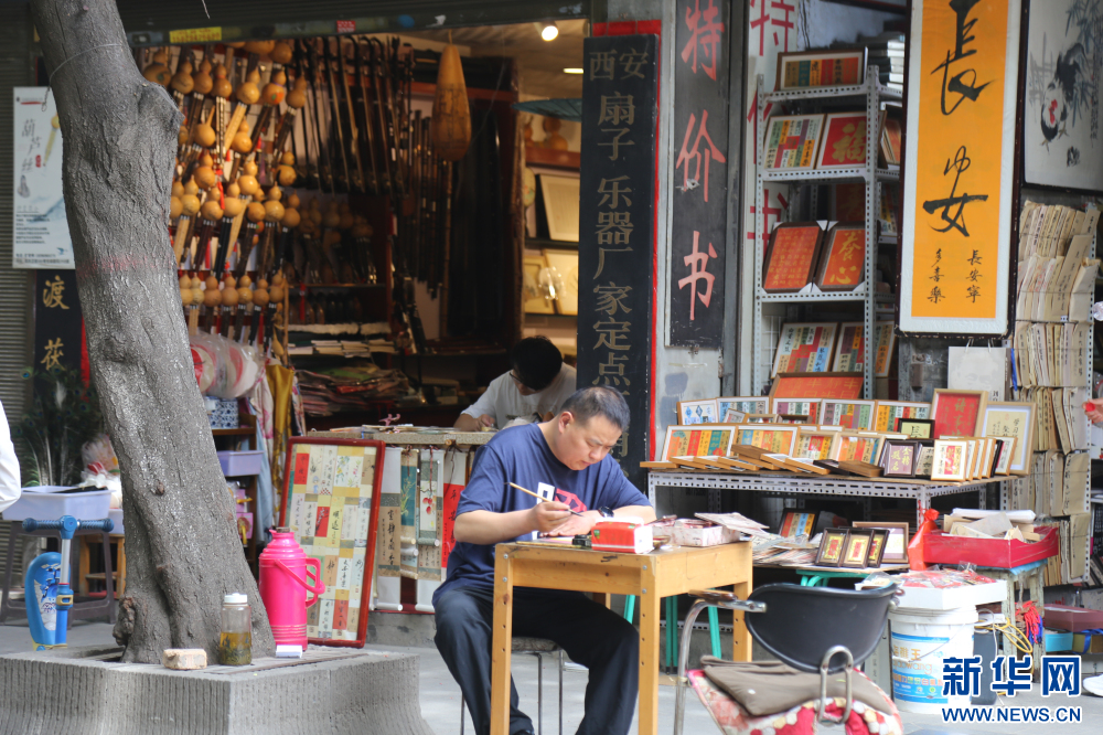 4月22日,在西安书院门,一位书画摊主正在作画。书院门里,处处都能感受到浓厚的文化氛围。新华网 张思思 摄