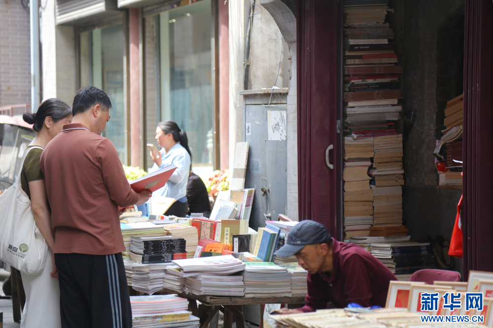 4月22日,在西安书院门书摊前,游客正在认真阅读选购书籍。新华网 张思思 摄