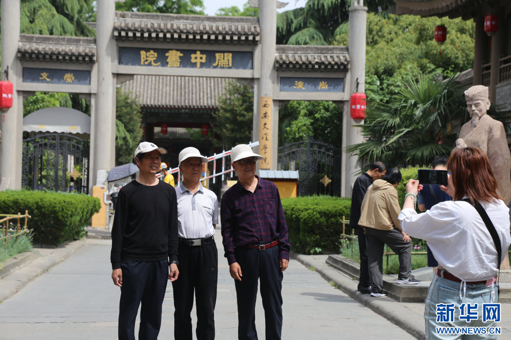 4月22日,游客在关中书院门前合影留念。关中书院位于西安书院门里,是明、清两代陕西的最高学府,也是全国四大著名书院之一。新华网 张思思 摄