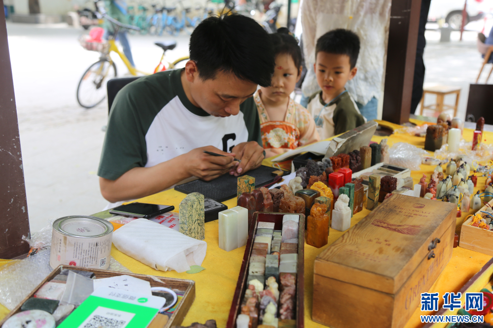 4月22日,在西安书院门,一位正在雕刻印章的摊主,吸引了小朋友的目光。新华网 张思思 摄