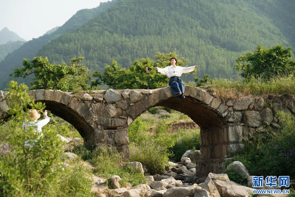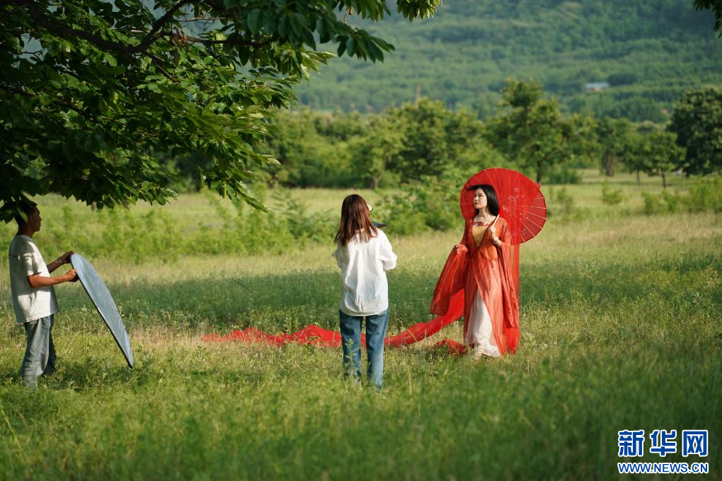 5月15日,游客在西安市长安区子午街道南豆角村拍照游玩。