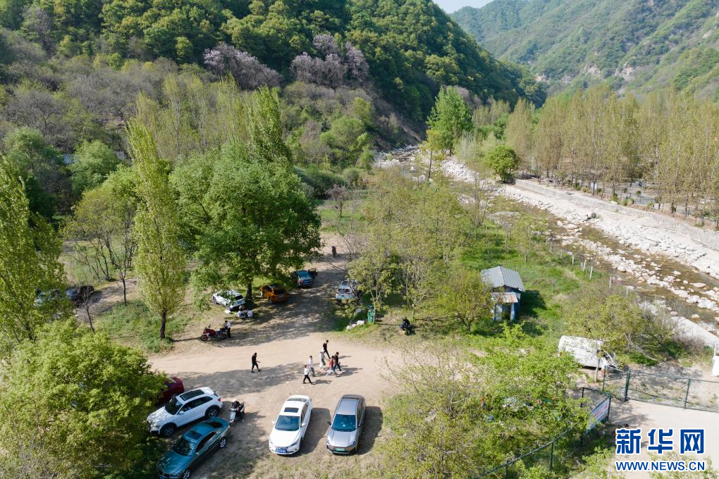 游人在西安市长安区滦镇街道黎元坪村游玩(4月12日摄,无人机照片)。
