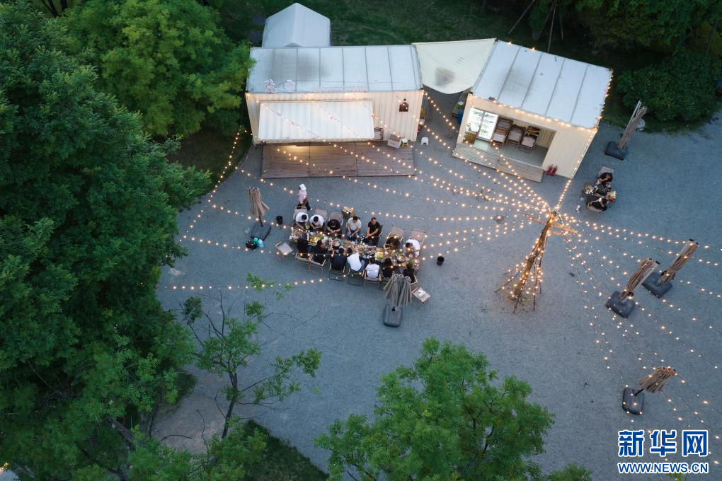 5月15日,游客在西安市长安区“长安唐村”景区内就餐(无人机照片)。