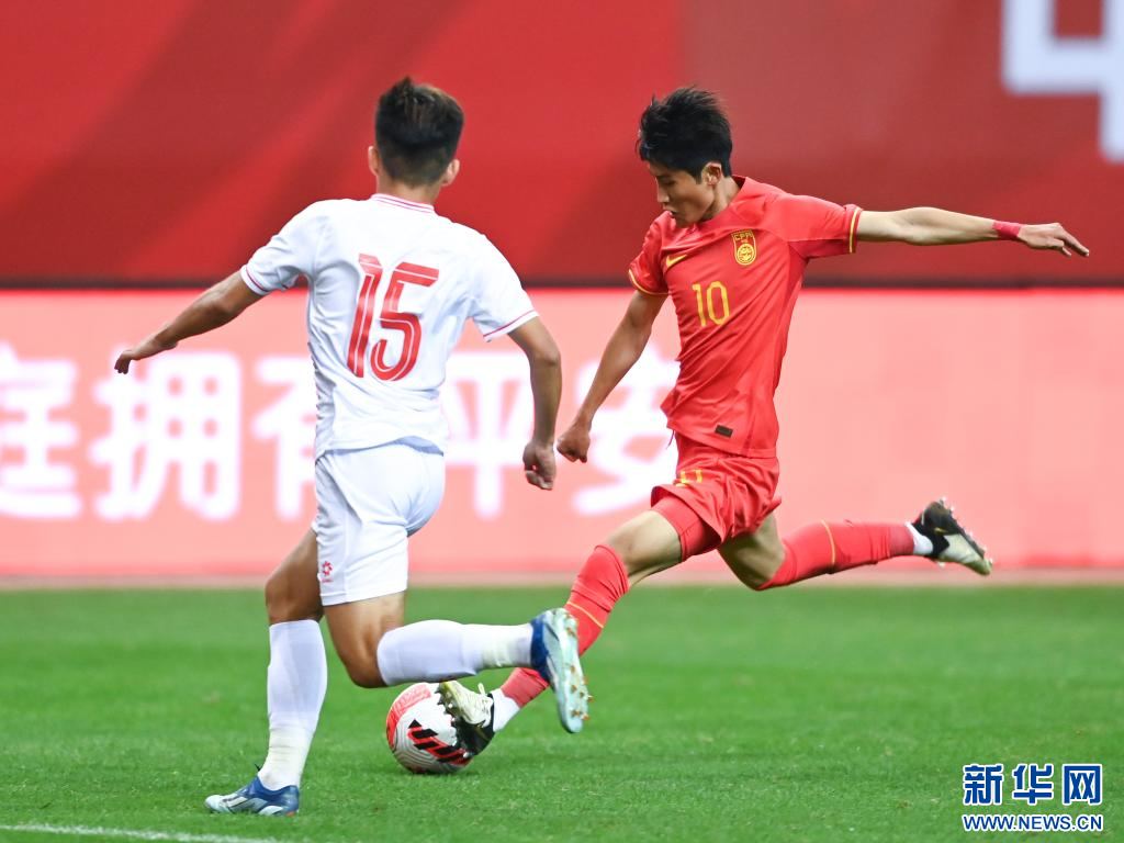6月4日,中国队球员刘诚宇(中)在比赛中拼抢。新华社记者 邹竞一 摄