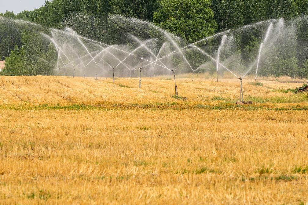 在河北省武邑县张庄村,很多种植户采用随播种、随浇灌的方式应对高温干旱天气。种粮大户张有良刚完成一块田的玉米播种,就掏出手机轻点几下,打开田边的灌溉水泵。清冽的水流通过软管传送到自动喷灌机上,水雾弥散,滋润着被高温炙烤的土地。