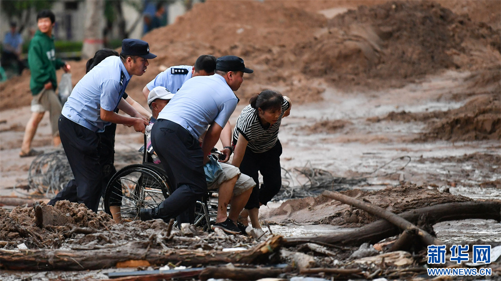 7月17日,执勤民警协助行动不便的市民通过一处水毁路段。新华社记者 张博文 摄