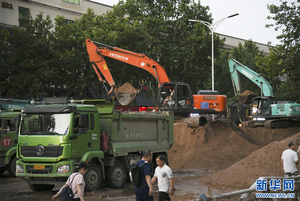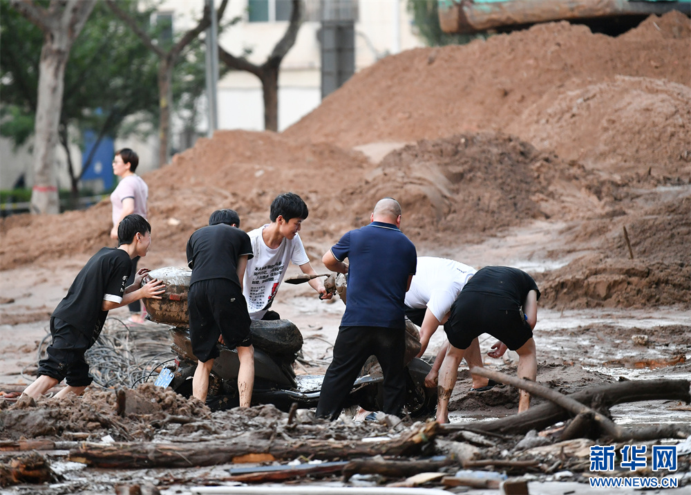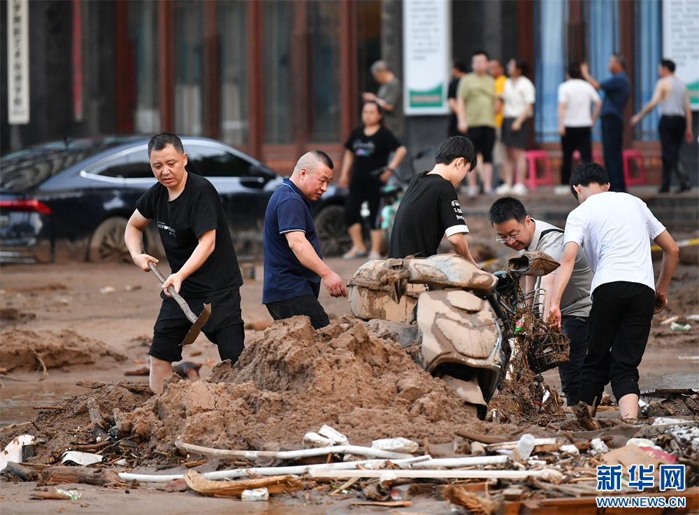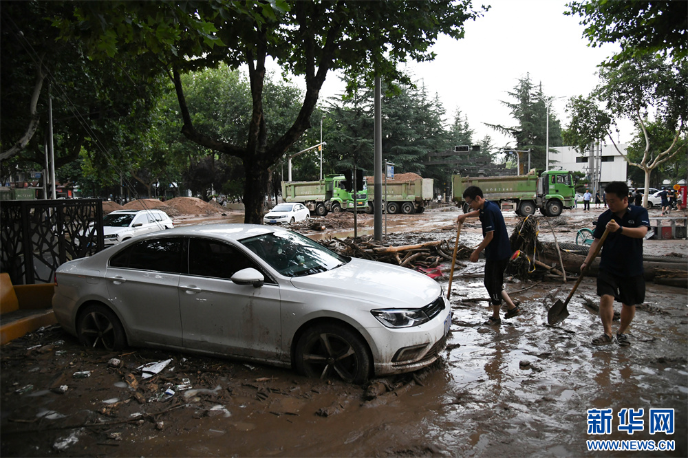 7月17日,市民在陕西省宝鸡市渭滨区一处路段清理淤泥。新华社记者 张博文 摄pagebreak