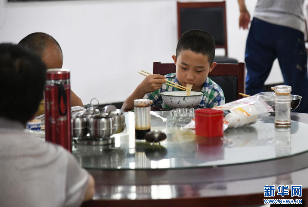 7月19日,受灾群众在宝鸡市凤县河口镇一处安置点吃晚餐。