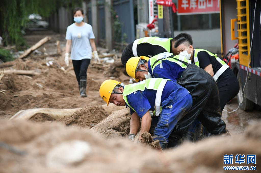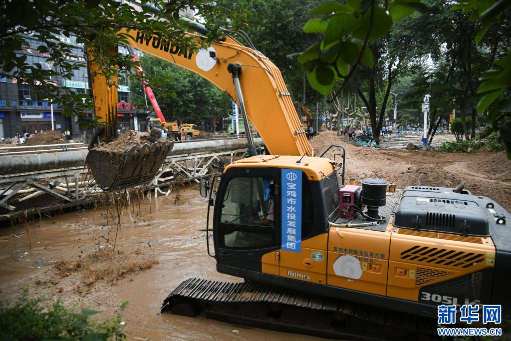 7月19日,救援人员在宝鸡市城区一处受灾路段开展清淤工作。
