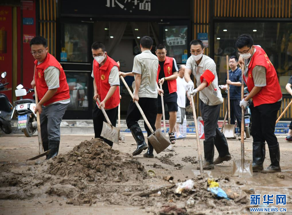 7月19日,志愿者在宝鸡市城区清理淤泥。
