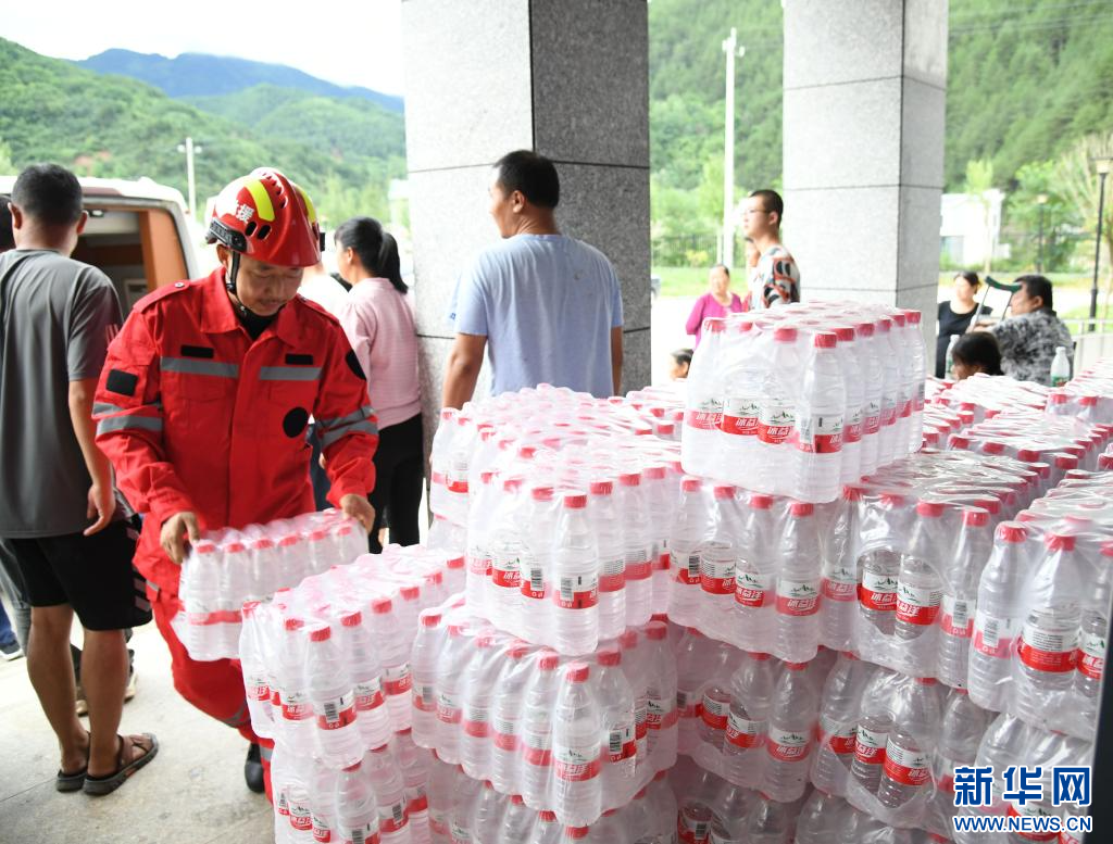 7月19日,救援人员(左二)在宝鸡市凤县河口镇一处安置点搬运物资。