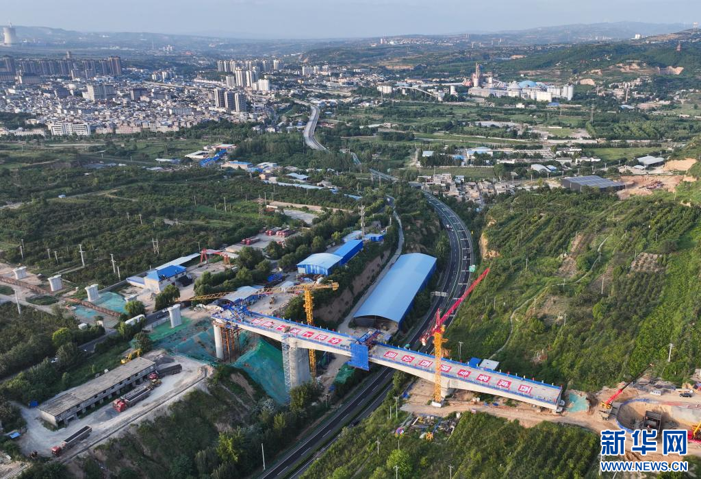 这是西延高铁铜川跨包茂高速公路特大桥施工现场(8月30日摄,无人机照片)。