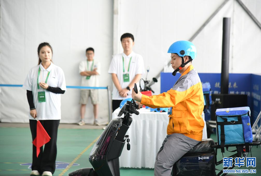 9月11日,选手在位于西安国际会展中心的比赛场地参加网约配送员工种比赛。