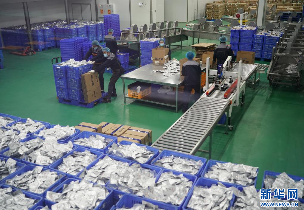 工人在安康市石泉县一家预制菜生产企业车间内工作(2023年4月3日摄)。