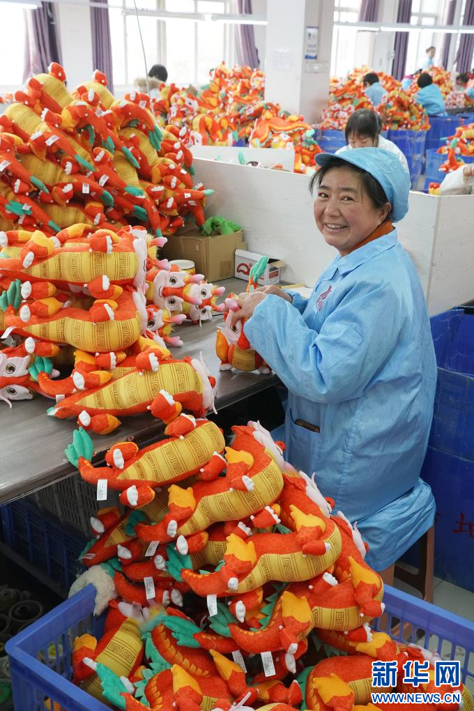 工人在安康市汉滨区一家毛绒玩具生产企业车间内加工龙年生肖主题毛绒玩具(2月19日摄)。