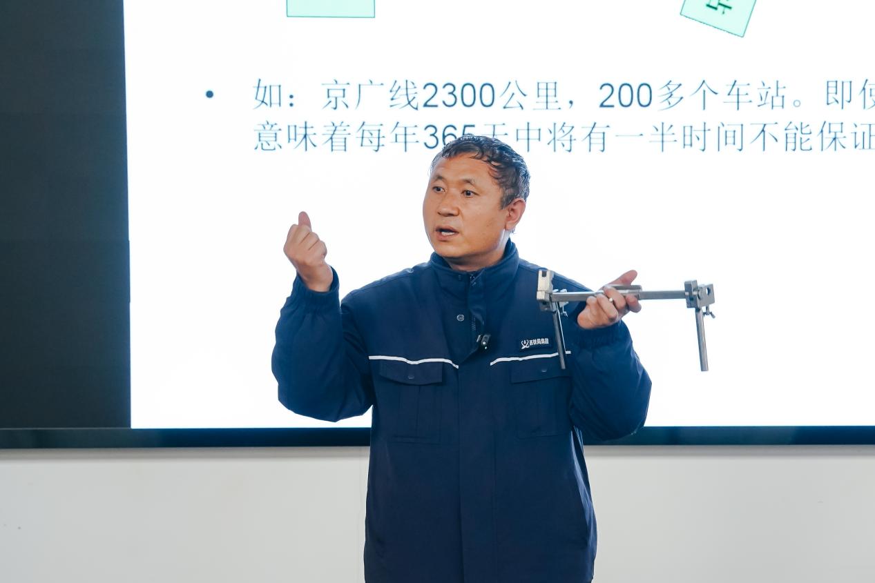 在宝鸡供电段实训基地,曹军明给工友们讲解接触网设备检修工艺。刘一江 摄