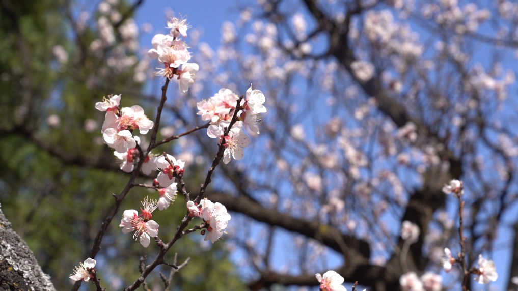 近日,在陕西西安临潼区骊山深处,层层梯田上,麦苗翠绿,杏花粉白如云,李花绛紫似霞,美不胜收。