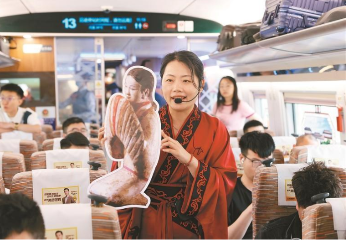 汉景帝阳陵博物院讲解员在高铁上为旅客讲解馆藏代表性文物(记者李明 通讯员李曼丽 摄)