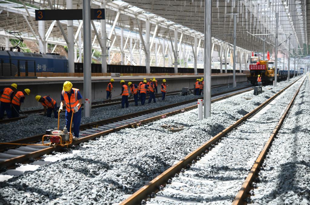 7月1日,中铁十一局工人在延安站施工。新华社记者 张博文 摄