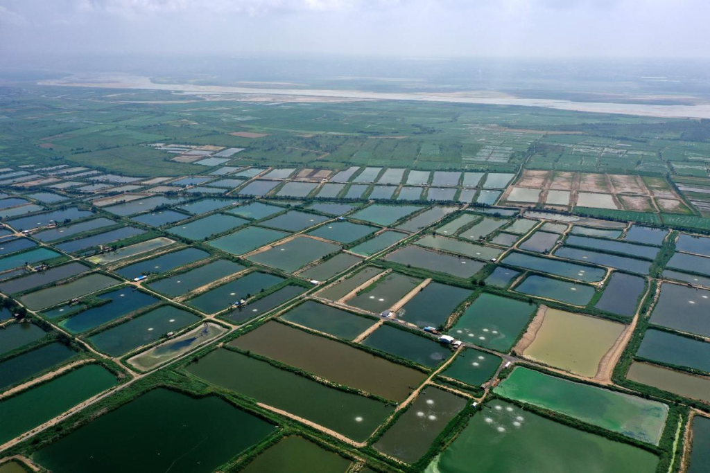 7月1日,无人机俯瞰黄河西侧陕西合阳段,蓝天白云下,万亩鱼塘蔚为壮观。崔正博 摄